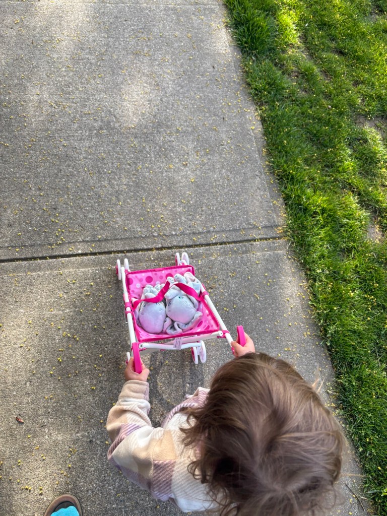 Even if it’s just play, my daughter loves community. Even if it is just the idea of community on this particular day with not as many hard lessons about sharing, taking turns, and acting kindly, my daughter showed me how much she loves caring for her “babies”.