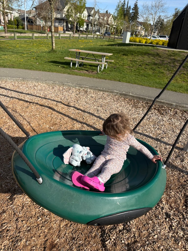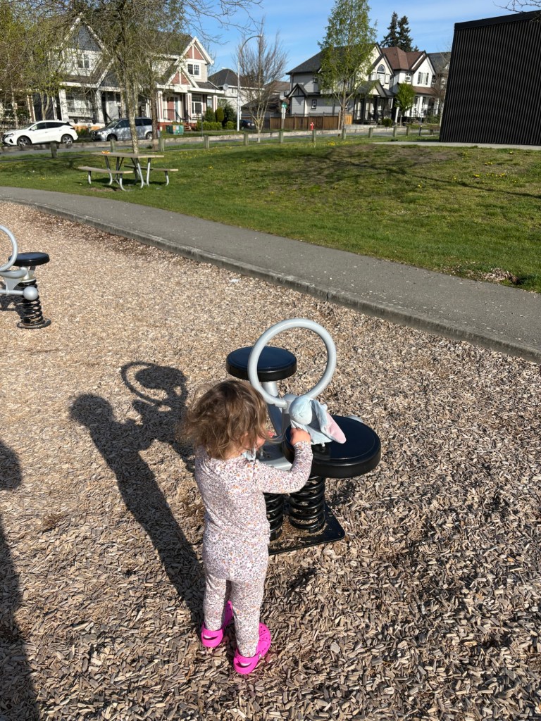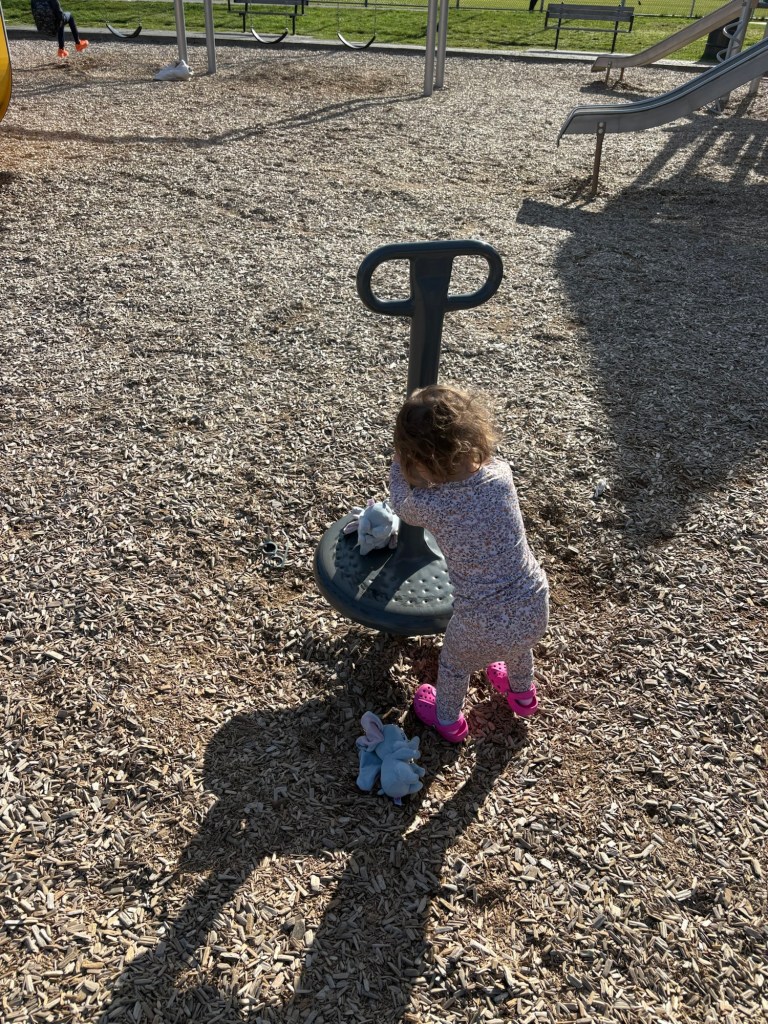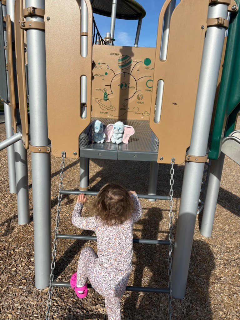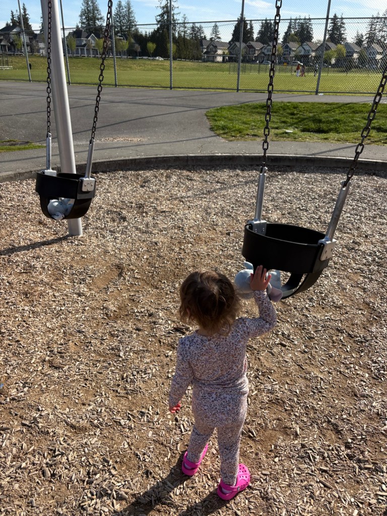 Much of my experience of parenting has been learning how much my daughter loves being in community. Her play spaces include a play kitchen, in which she “bakes” cupcakes for tea parties, a doctor set with which she “assesses and treats” her clients (mostly her Papa), and a whole community of stuffed animals that she regularly plays with. One day, we were getting ready for a walk outside and I found that a toy stroller was waiting with two stuffed elephants that Elly calls her babies. She walked with her Papa and I to the park with her babies until she realized that they had some problem (perhaps that their stuffing wasn’t sitting quite right). She stopped, got in front of the stroller and adjusted her babies so that they were more comfortable. Through the whole time we were at the playground, Elly enjoyed putting the babies on various playground rides.